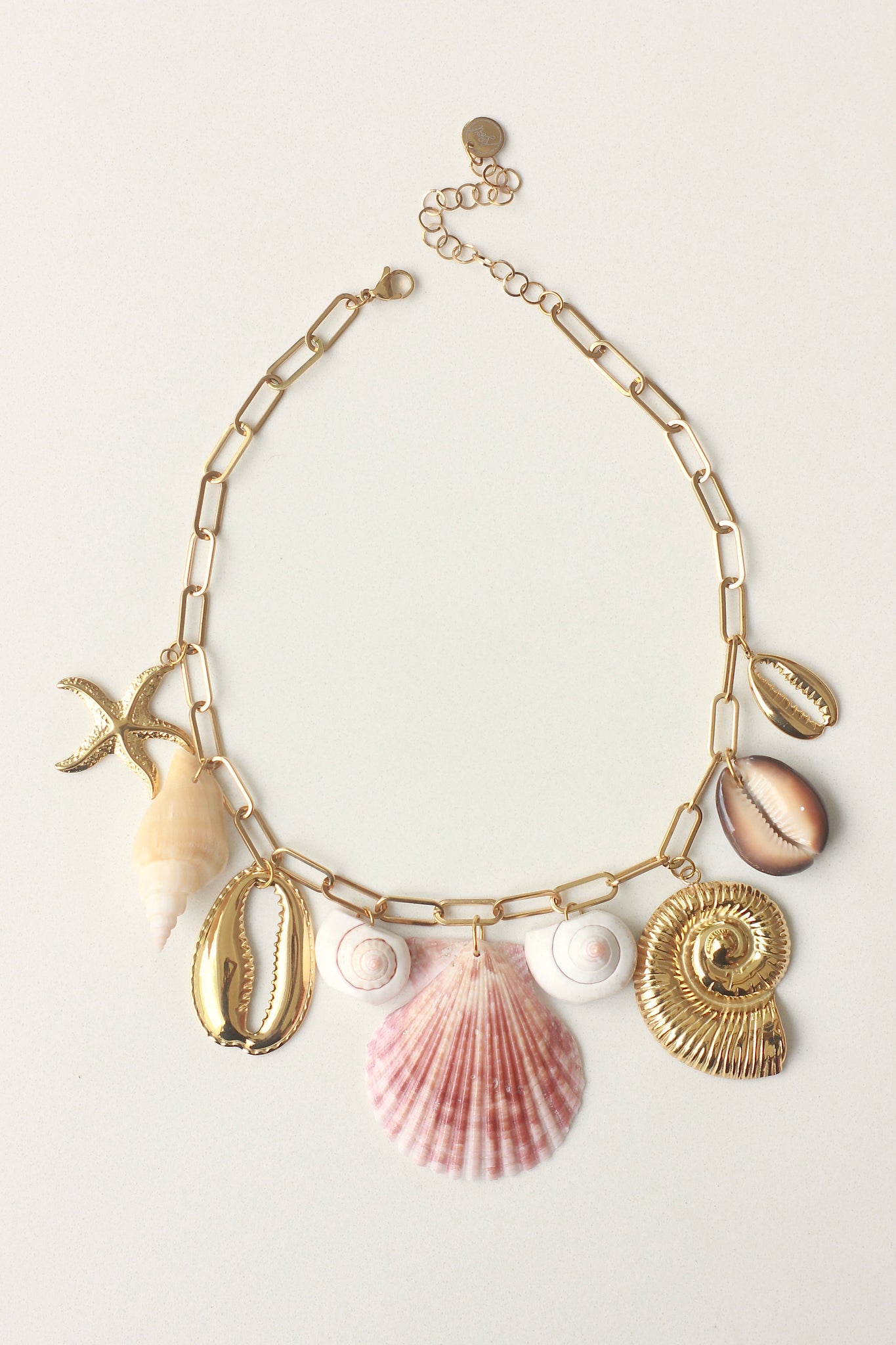 A trendy paperclip necklace featuring a natural scallop centerpiece, accented with assorted shells and marine-themed stainless steel charms. Chic and beachy, this piece brings a touch of the ocean to any outfit. 🐚✨